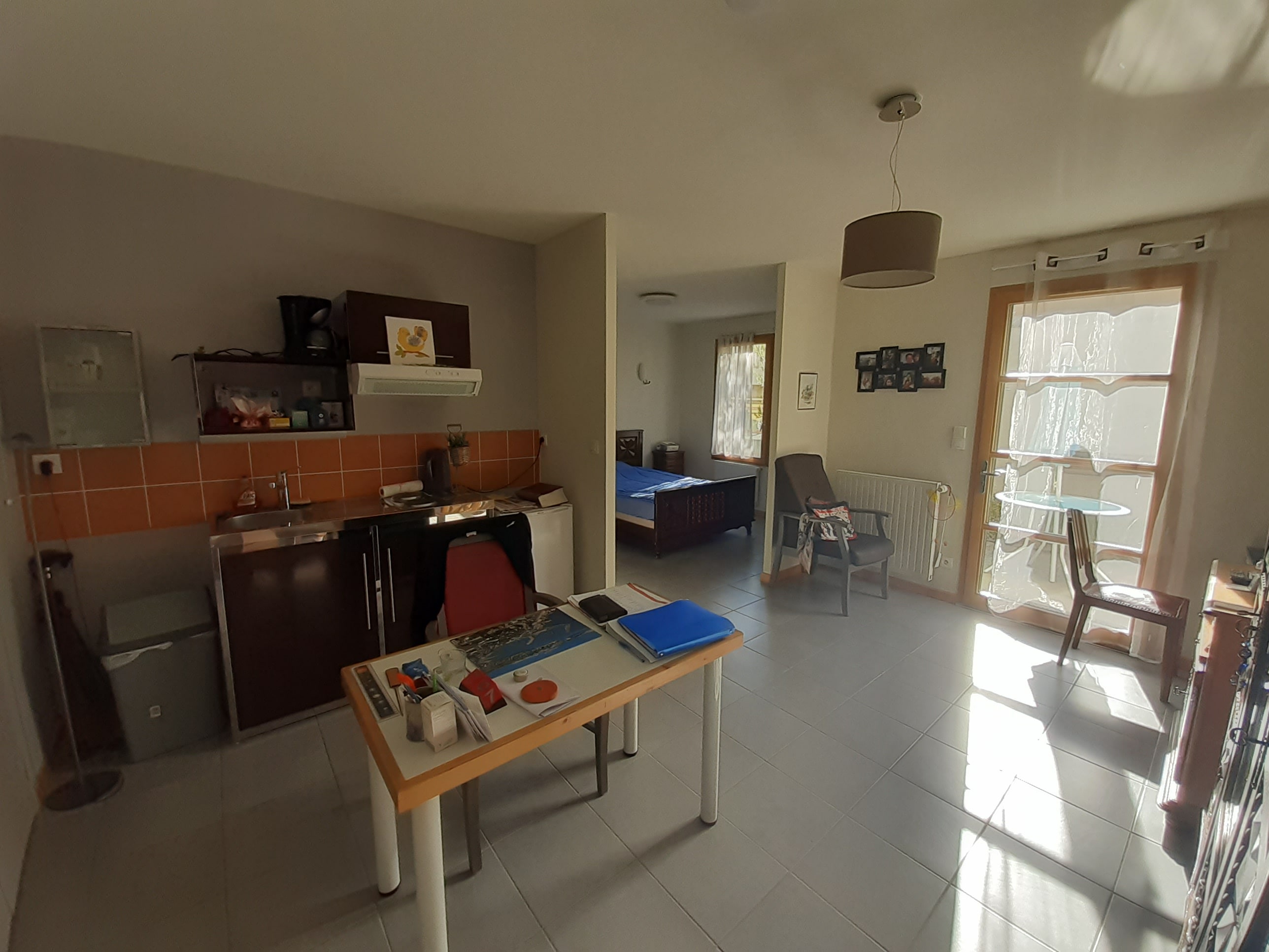 • D’une cuisine équipée (évier, plaques électriques, meuble de rangement)